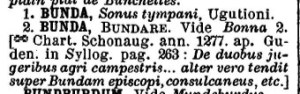 Angesichts dessen, dass es in kaum einem Lateinischen Wörterbuch zu finden ist, wird man davon ausgehen dürfen, dass es sich bei dem lateinischen Hauptwort bunda um ein sehr altes handelt. In der Tat gefunden werden kann es in DU FRESNE DU CANGE, Glossarium manuale ad scriptores mediae et infimae Latinitatis, Tomus I, Niort (1883), 779, wo dazu, was folgt, zu lesen ist: