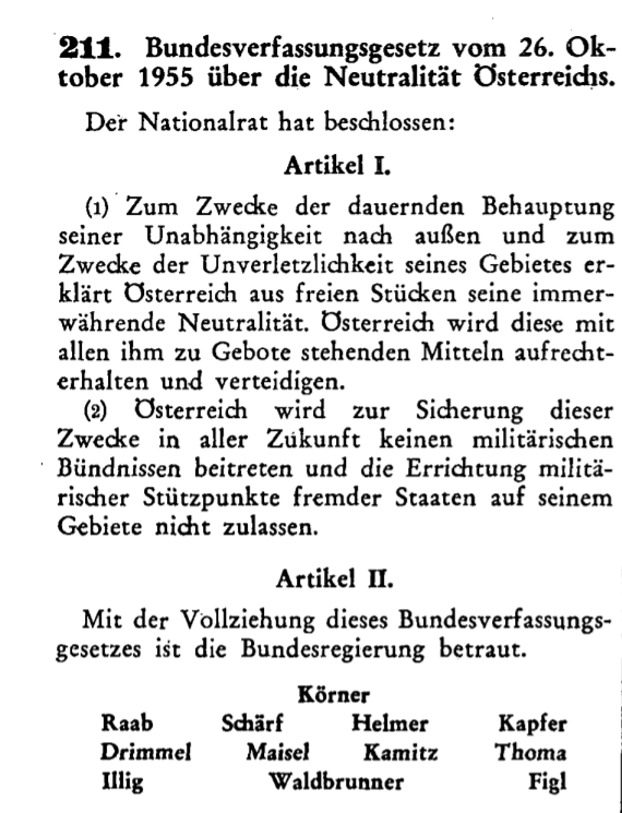 Nach Abschluss des Staatsvertrages von Wien vom 15. Mai 1955 (BGBl 152/1955), welcher den Besatzungszustand durch die vier Alliierten Mächte beendete und die Eigenschaft Österreichs als Feindstaat im Sinne des Artikels 107 VN-Charta aufhob, beschloss das österreichische Parlament am 26. Oktober 1955 das Bundesverfassungsgesetz über die Neutralität Österreichs (BGBl 211/1955). Dieses Bundesverfassungsgesetz trat am Tag nach seiner Kundmachung (4. November 1955) in Kraft. Darin heißt es im Wesentlichen, wie folgt: