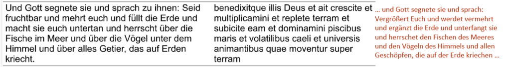 Nachfolgend findet sich eine Gegenüberstellung der herkömmlichen (lutherischen) Übersetzung des 28. Verses des 1. Kapitels der Genesis, dessen lateinischen Textes, und meiner Übersetzung (in rotbraun).
