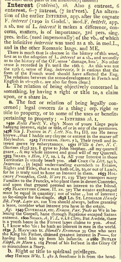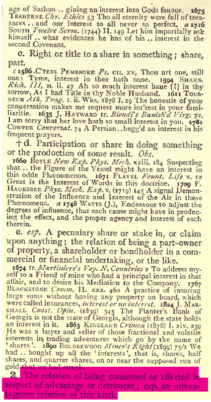 Der farblich hervorgehobene Punkt 2. erscheint hier einschlägig und passend zu sein: Interesse ist die Beziehung, betreffs eines Vorteils oder Nachteils betroffen (von etwas) zu sein. Ein Interesse an einer Sache hat somit jener, der durch sie positiv oder negativ in seinem Leben beeinflusst ist.