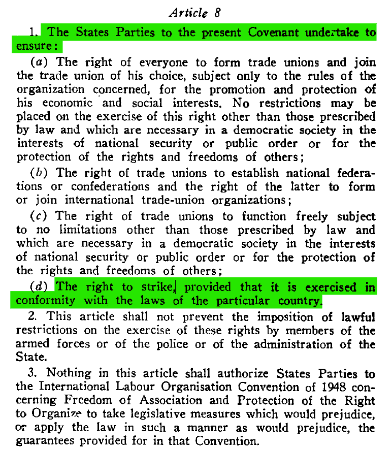 In diesem Zusammenhang ist auch Absatz 3 des Artikels 8 CRSCR von Bedeutung, der konkret verbietet, dass die Vertragstaaten der ILO-Konvention das Streikrecht gesetzlich beschränken: dies trotz des Wortlautes des Absatzes 1 (d). Daraus folgt, dass den Streik betreffende Gesetze nur etwa im öffentlichen Interesse unbedingt erforderliche ordnungspolizeiliche Vorschriften enthalten dürfen, womit wir im Ergebnis bei der Formel sind, wie sie etwa die Unterabsätze (a) und (c) des zitierten Artikels 8/1 CRSCR aufweisen, und die Bezug auf demokratische Gesellschaften nimmt.