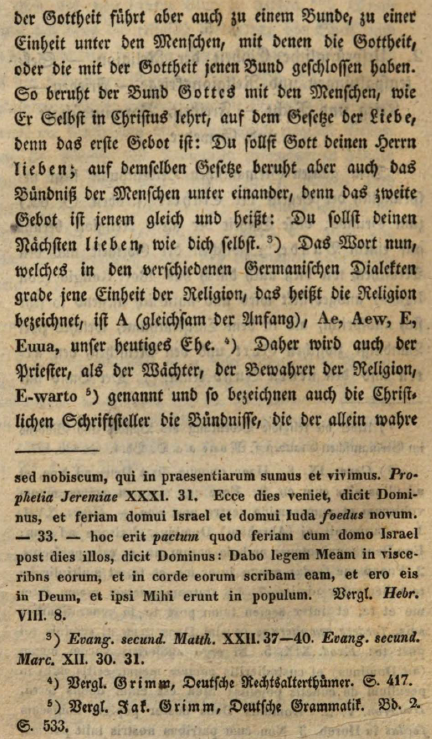Die Ehe (zwischen Mann und Frau, aus der einzig und göttlich Leben hervorgehen kann) ist demnach geradezu der Urgrund für die Religion und zugleich für das Recht, und umgekehrt. Vgl. auch Phil. 2,5f.: