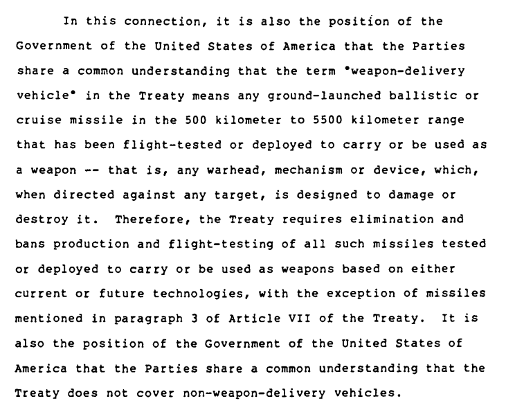 Im jetzt wieder ins Gerede gekommenen INF-Treaty dessen Text in 1657 UNTS zu finden ist, fällt auf, dass der Begriff des warhead nicht definiert ist; ebendort (1657 UNTS 462) findet sich lediglich ein diplomatischer Briefwechsel zwischen den USA und der UdSSR, in dessen US-amerikanischem Teil es heißt, wie folgt: