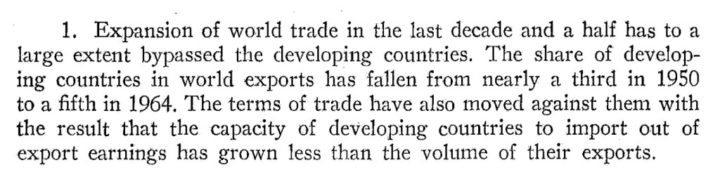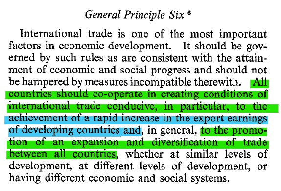 Auf ihrer 1964 in Genf abgehaltenen Tagung verabschiedete die United Nations Conference on Trade and Development (UNCTAD) generelle Prinzipien (E/CONF.46/141, Vol. I, Annex A.I.1) aus denen ich das Sechste herausgreife; es lautet: