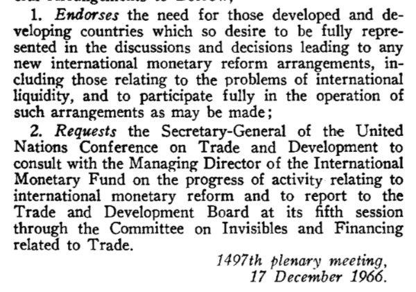 Vor diesem, hier nur straff umrissenen, Hintergrund verabschiedete die UNGA ihre Resolution 2208(XXI), International monetary reform, in der es auch unter Bezugnahme auf den vorhin zitierten Expertenbericht u. a. heißt: