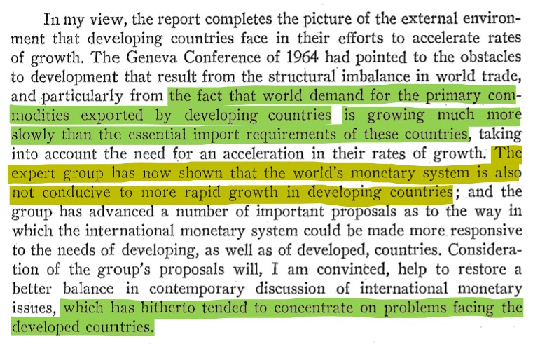 Ein gutes Jahr später nahm eine von den Gremien der UNCTAD beauftragte Expertenkommission ihren Bericht mit dem Titel: International Monetary Issues and the Developing Countries (TD/B/32), an. In seinem Vorwort wird u. a. ausgeführt, was folgt: