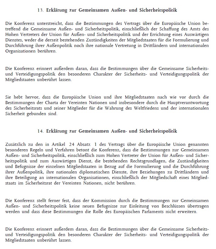 Diese beiden Erklärungen stehen ihrem Wortlaut nach somit in diametralem Widerspruch zu den, oben verlinkt, erörterten Bestimmungen des EUV betreffs der GASP der EU.