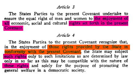 Indem sich, was die entsprechenden farbigen Hervorhebungen belegen, das such rights im Artikel 4 nur auf die im Artikel 3 abstrakt genannten Rechte (jeweils magenta Hervorhebung) beziehen kann, ist klar, dass mit those rights (im Artikel 4) solche gemeint sind, die der Staat in Anwendung des Paktes etwa gesetzlich vorkehrt: Diese dürfen die im Artikel 3 genannten Rechte (orange Hervorhebung) nur solchen Beschränkungen unterwerfen, die mit der Natur dieser Rechte vereinbar sind und die dazu dienen, das allgemeine Wohl in einer demokratischen Gesellschaft zu fördern.