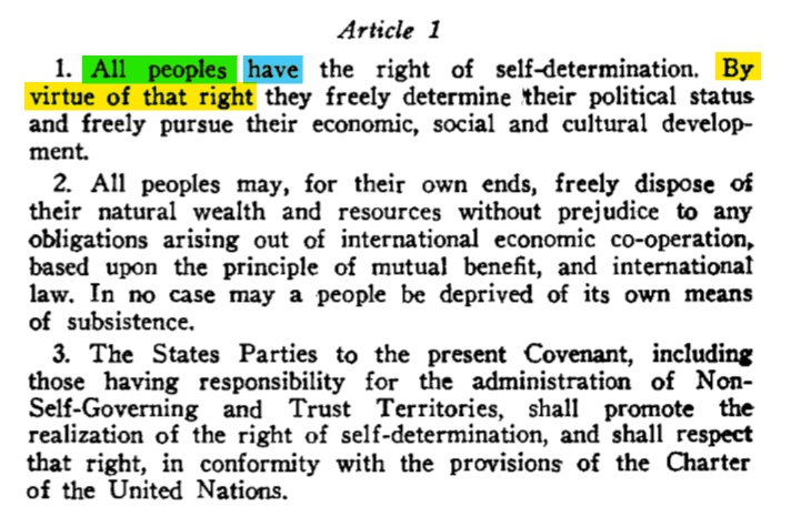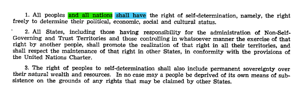 Der jeweilige Artikel 1 dieser Entwürfe, welcher sich mit dem Selbstbestimmungsrecht der Völker befasst, lautete: