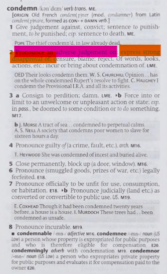 Indem hier zum Verbum condemns der Passus in the strongest terms hinzugefügt worden ist, kann dessen Bedeutung nur die zweite sein, die bei SOED aufgelistet ist, jedenfalls aber nicht die erste: