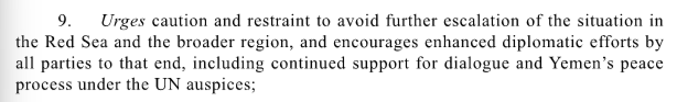 Hätte der UNSC hier eine rechtliche Notwendigkeit gesehen, gegen die Houthie-Aktionen vorzugehen, hätte er nach Artikel 39 UN-Charta eine Verletzung des Internationalen Frieden feststellen und nach Artikel 42 entsprechende Gewaltmaßnahmen anordnen müssen, was beides nicht geschehen ist!