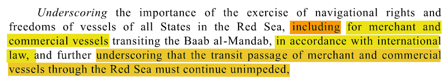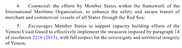 Die OPP4 und 5 der Resolution beziehen sich somit offenkundig nicht auf die Eindämmung der Not-Aktionen der Houthies, sondern auf die Herstellung und Aufrechterhaltung eines universell freien Schiffverkehrs, der de dato nicht existiert!