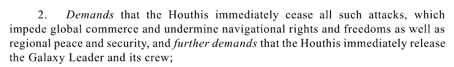 Wenn also im OP2 die Einstellung der Aktionen der Houthies verlangt wird, dann nicht, weil diese rechtswidrig wären, sondern weil sie nicht jenem Zustand entsprechen, der vertraglich an sich vorgesehen und wünschenswert wäre. Zumal in PP4 bereits eben diesen herzustellen implizit begehrt wurde, kann hier somit auch die Freilassung des Galaxy Leader verlangt werden, welche somit redundant wird, sofern der genannten Forderung entsprochen wird.