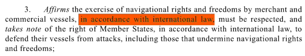 Demgemäß stellt der UNSC hier das zur Kenntnis genommene Recht der Mitgliedstaaten, deren Schiffe gegen Angriffe zu verteidigen, unter das Völkerrecht, was hier, nach dem bereits Gesagten und noch folgenden, dazu führt, dass gegenständlich kein Anlassfall für die Anwendung solchen Rechts als bestehend betrachtet wird, was dadurch unterstrichen wird, dass im letzten Halbsatz solche Fälle betont werden, die nautische Rechte und Freiheiten unterminieren, was hier, wie zu zeigen ist, nicht der Fall ist.