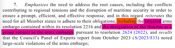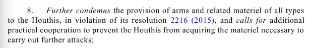 Erst im OP8 wird sodann das Versehen der Houthis mit Waffen verurteilt, was demnach in eine Zukunft deutet, die nach Herstellung des zuvor geforderten und angesprochenen Soll-Zustandes anzustreben sei.