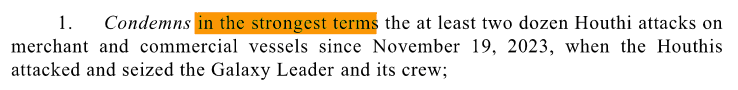 Sehr wohl aber bei der zweiten Bedeutung, die in ihrer in Magenta hervorgehobenen Variante Abstufungen zulässt. Indem die zweite (orange) Variante aber selbst schon das Adverb strong beinhaltet, bedeutet die vom UNSC gewählte Formulierung einen Pleonasmus, der die in Frage stehende Jemenitische Aktion in Wahrheit nicht schlecht reden will, sondern nur ihre grundsätzliche Ablehnung kontrastieren soll, welche deshalb erfolgt, weil die von Jemen erfüllte Aufgabe an sich, nach der Suez-Konvention, Ägypten zukäme, das aber offenbar gewaltsam gehindert wird, hier einzuschreiten. Siehe dazu meinen X-Post-Thread: