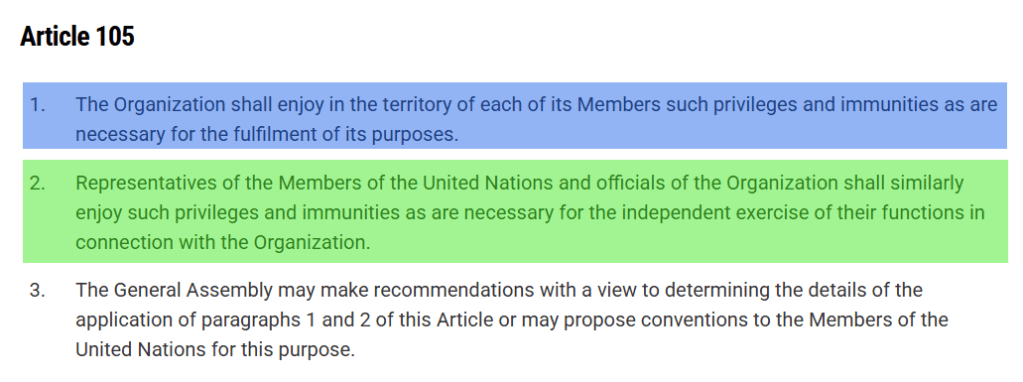 Aufgrund der Vorrangigkeit, welche der unparteiisch eröffneten Möglichkeit, in Organen der UNO mitzuwirken, gegenüber nationalen Interessen des Sitzstaates aufgrund Artikel 105/2 UN-Charta zuzukommen hat, sollte sich eine Regelung der Visafrage im UN-US-Sitzabkommen darauf beschränken, den Repräsentanten dazu zu verpflichten, die kürzest mögliche Transitroute vom Einreiseflughafen zu den Headquarters der UNO zu wählen und davon nicht abzuweichen, sich also, von dieser Transitfahrt abgesehen, ausschließlich auf UN-Gebiet aufzuhalten.