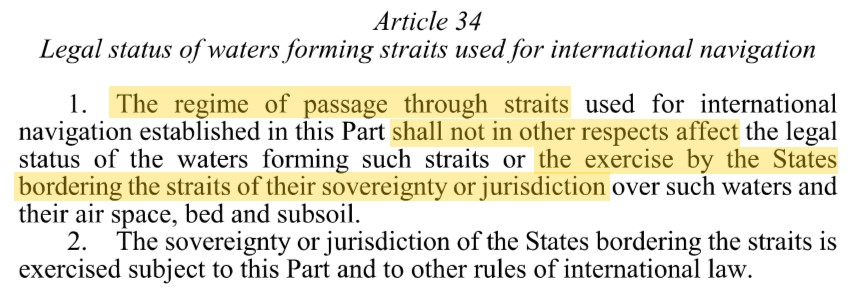 Er stellt klar, dass die Anrainerstaaten von Seestraßen in anderen Aspekten (als jenen, die im Regime der UNCLOS geregelt sind) Herr ihrer Souveränität darüber bleiben.