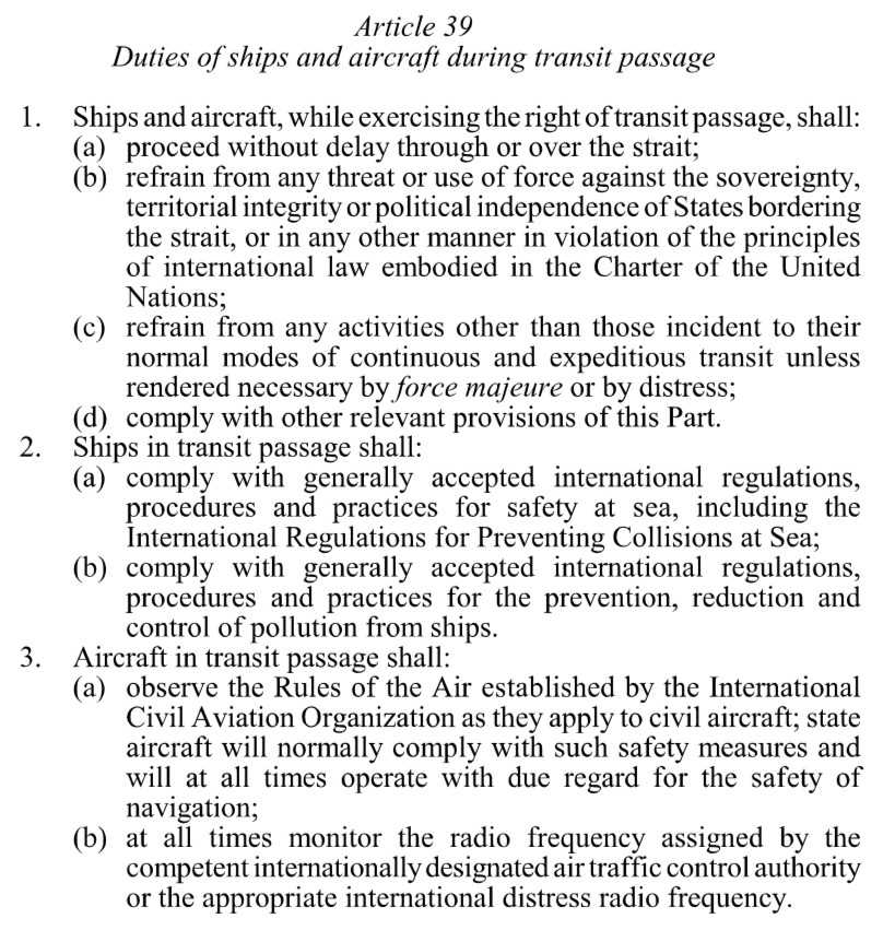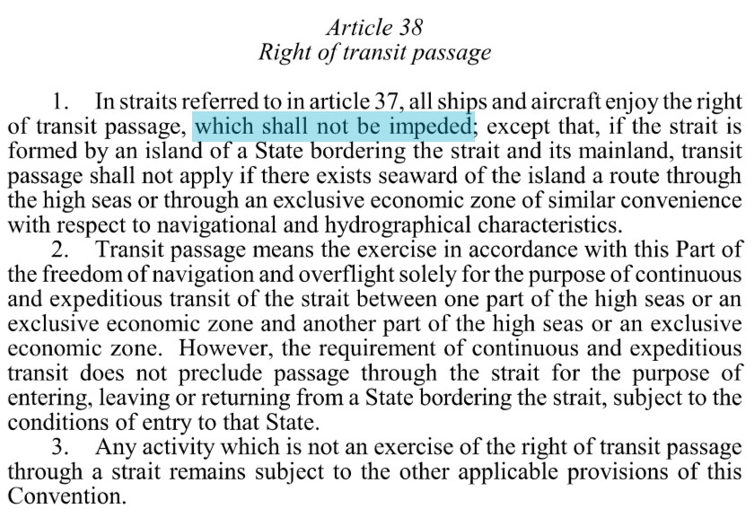 Zumal in Artikel 38 zuvor die Rede vom Recht der friedvollen Passage ist, ergäbe der Beisatz: which shall not be impeded, wenn er nicht von, das Recht einschränkender, Bedeutung wäre, nur pleonastischen Sinn, was in der völkerrechtlichen Legislative auszuschließen ist.