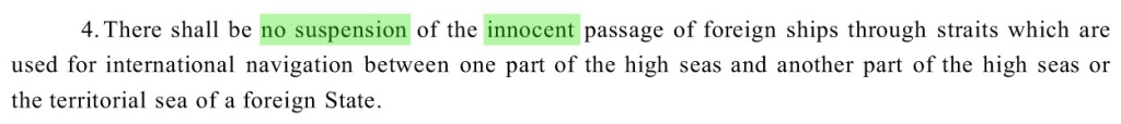 In Grün hängt an Artikel 16/4 der 1958-Konvention über die Territorial Sea, in dem von suspension und innocent die Rede ist: Das Verlangen von Gebühren, auf die die oben genannten Bedingungen zu treffen, ist keine Sperre der Straße! Nocent aber verhält sich ein Staat, der die Passage erzwingen will, ohne solche Gebühren zu entrichten.